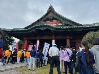 8:30モータープールに到着。余力ある男性陣は、金山頂上の新田神社まで足を延ばしました。